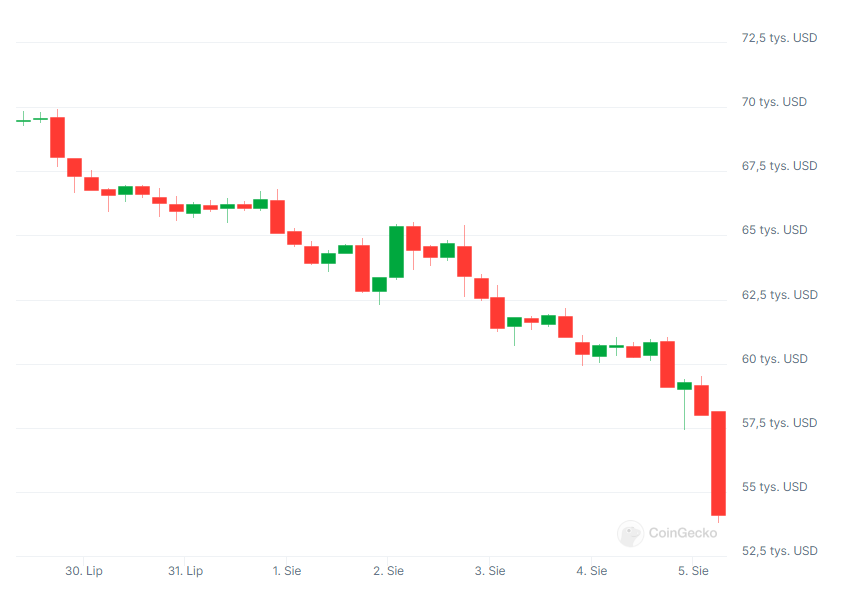 Nowy tydzień nie mógł zacząć się gorzej. Słaba kondycja Bitcoina w ostatnich dniach zderzyła się twarzą w twarz z fatalnymi wiadomościami ze światowych parkietowych parkietów z Japonią i USA na czele, niepokoją też nastroje geopolityczne. Kurs BTC wziął głęboki oddech i zanurkował, inwestorzy tratowali się wzajemnie próbując wyprzedawać kryptowaluty. W pewnym momencie traciliśmy 2 punkty procentowe co każde 15 minut.