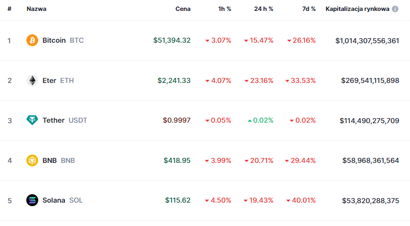 Wykres kursu kryptowaluty Bitcoin, para BTCUSD, interwał 1D, źródło: CoingeckoJeszcze gorzej prezentuje się sytuacja na na altcoinach. Największy z nich, Ethereum (ETH) spada już o 23% w ujęciu 24-godzinnym oraz o jedną trzecią (!) na interwale tygodniowym. Solana (SOL), dotychczas murowany kandydat który radził sobie choćby lepiej niż sieć Vitalika Buterina, oberwała jeszcze mocniej: w ujęciu tygodniowym straciła aż 40%.