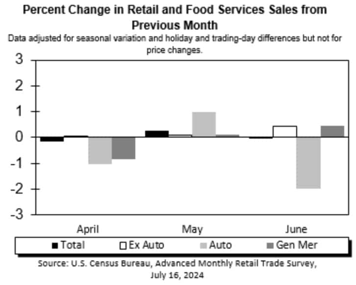 Sprzedaż detaliczna z wyłączeniem samochodów, benzyny, materiałów budowlanych i usług gastronomicznych wzrosła w czerwcu o 0,9% po wzroście o 0,4% w maju. To tak zwana podstawowa sprzedaż detaliczna, która najmocniej odpowiada składnikowi wydatków konsumpcyjnych produktu krajowego brutto. W pierwszym kwartale gospodarka USA rosła o 1,4% rocznie, szacunki dla II kw. sugerują 2% wzrost.
