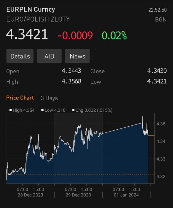 Źródło: BloombergPo potężnym umocnieniu, w IV kwartale 2023 roku, PLN zyskał najmocniej spośród globalnych walut. Umocnił się do każdej waluty z G10. Sam USDPLN spadł o ponad 10%, a EURPLN ponad 7%. Silniejsze na tle dolar czy euro okazały się japoński jen, czy korona norweska. Tymczasem sytuacje, jak opisana wyżej często służą jako odpowiednie tło do budowania paniki i grania na emocjach. Na szczęście tym razem, sytuacja wydaje się oczywista i opanowana. Znany jasnowidz z Człuchowa, zdążył skomentować swoją wizję Live. Podziękował Bogu, iż 'dziwna sytuacja’ okazała się błędem Google.
