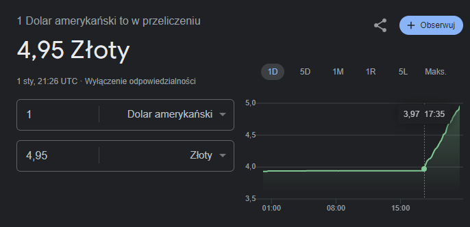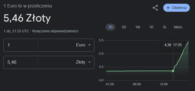 Szaleństwo bowiem wynika z błędu Google, być może NBP nie dostarczył przed 1 stycznia aktualnych danych dot. kursów walut. Aktualnie wg. danych w Bloombergu, złoty nie doznał żadnego szoku. Za dolara płacimy wciąż 3,92, a za euro 4,33. Do sytuacji odniósł się błyskawicznie nowy minister finansów Andrzej Domański. „Spokojnie. Ten kurs złotego, który sieje panikę to „fejk” (błąd źródła danych). Za chwilę otworzą się rynki w Azji i sytuacja wróci do normy” – uspokoił.