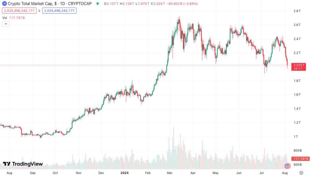 W ciągu ostatnich 24 godzin łączna kapitalizacja rynkowa kryptowalut spadła o 12,9 proc. do 1,96 bln USD, a z kapitalizacji aktywów cyfrowych usunięto ponad 292 mld USD. Ostatni raz tak gwałtowna wyprzedaż kryptowalut w ciągu trzech dni miała miejsce w połowie sierpnia 2023 roku.