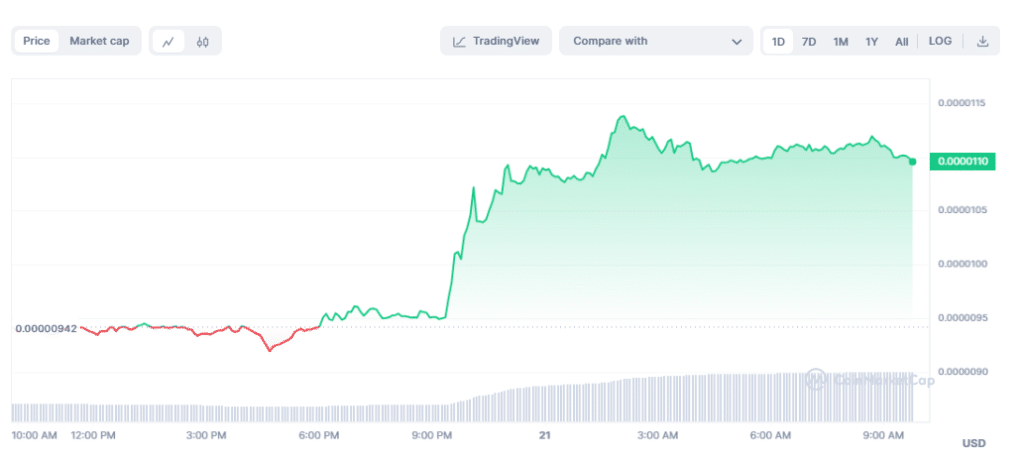 W ciągu niecałej doby cena PEPE wzrosła do 0.00001097 USD. Analitycy przewidują, iż kwota będzie wciąż wzrastać, osiągając nowe ATH.