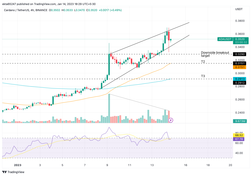 4-godzinny wykres ADA/USDTZarówno wolumen handlu, jak i wskaźnik momentum sygnalizują, iż wzrost na wykresie ADA/USDT jest krótkotrwały. Pierwszy cel wybicia w dół Cardano to pierwszy punkt, w którym ADA dotknęła górnej linii trendu tworzącej klin, na poziomie 0,3290 USD, a kolejne dwa najważniejsze poziomy to 50-dniowa EMA i 200-dniowa EMA po odpowiednio 0,2912 USD i 0,3151 USD.