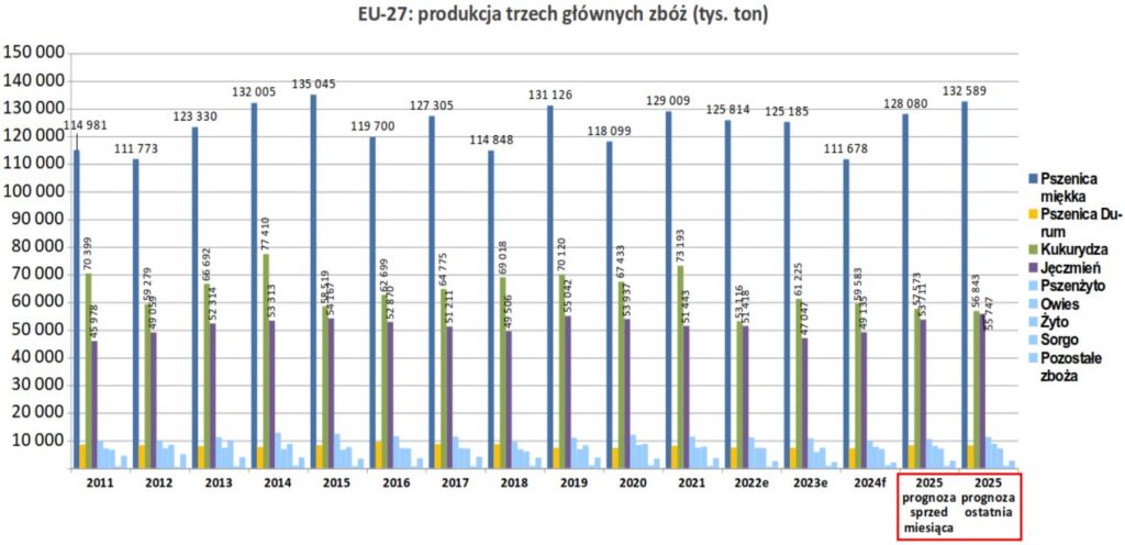 Za korektę w górę produkcji zbożowej (razem) odpowiada głównie pszenica i jęczmień. Komisja Europejska zrewidowała w górę swoje wcześniejsze szacunki zbiorów pszenicy ze 128,1 do 132,6 mln ton – najwyżej od 2015 roku. Obecne szacunki oznaczają 19% wzrost w skali roku i 8% powyżej średniej 5-letniej.