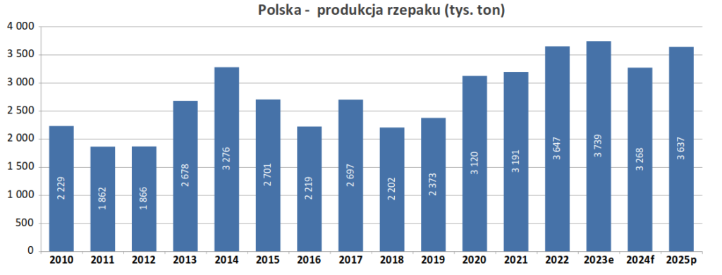Od 2022 roku areał zasiewów krajowego rzepaku przekracza nieco 1,0 mln ha. Pod zbiory w 2025 roku obszar rzepaku wzrósł do 1,097 mln ton z 1,010 mln ha w 2024 roku. Jeszcze miesiąc wcześniej areał naszych upraw rzepaku szacowano na 1,014 mln ha.