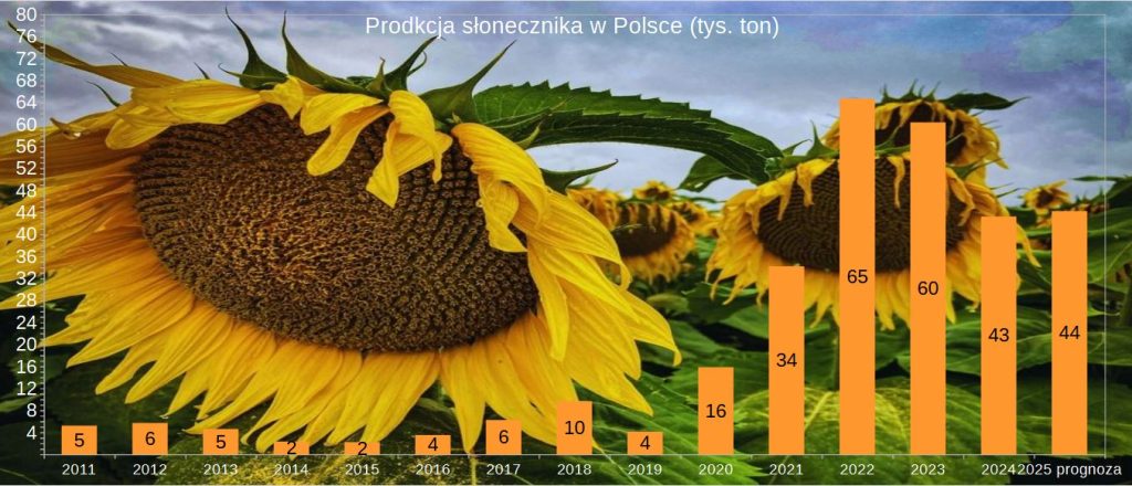 Polska pozostaje niewielkim w skali UE producentem słonecznika. W 2025 r. zbiory wzrosły do ok. 44 tys. ton po znacznym spadku rok wcześniej.