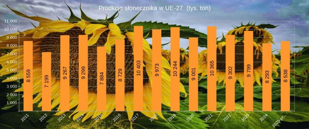 Według Komisji Europejskiej w 2025 r. zbiory słonecznika w UE wyniosą ok. 8,5 mln ton, czyli o 3% więcej niż w fatalnym 2024 r., ale przez cały czas będą to jedne z najniższych zbiorów ostatniego dziesięciolecia.