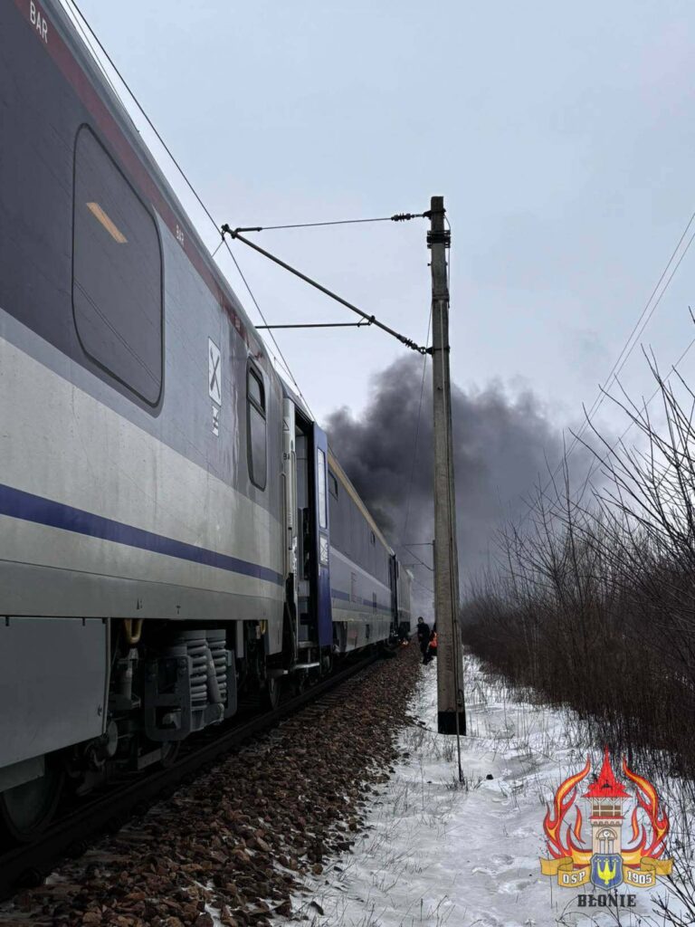 Dziś ok. godz. 1330 na przejeździe kolejowo-drogowym w miejscowości Błonie (woj. mazowieckie) pociąg PKP Intercity relacji Szczecin – Rzeszów uderzył w samochód osobowy. Kierowca auta zdążył opuścić pojazd przed zderzeniem ze składem. W wyniku zdarzenia wybuchł pożar, który objął zarówno auto, jak i lokomotywę.