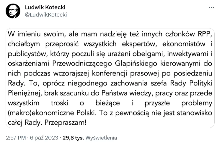 Za słowa prezesa Narodowego Banku Polskiego postanowił przeprosić Ludwik Kotecki, członek Rady Polityki Pieniężnej. Swoje oświadczenie opublikował w serwisie X (dawny Twitter):
