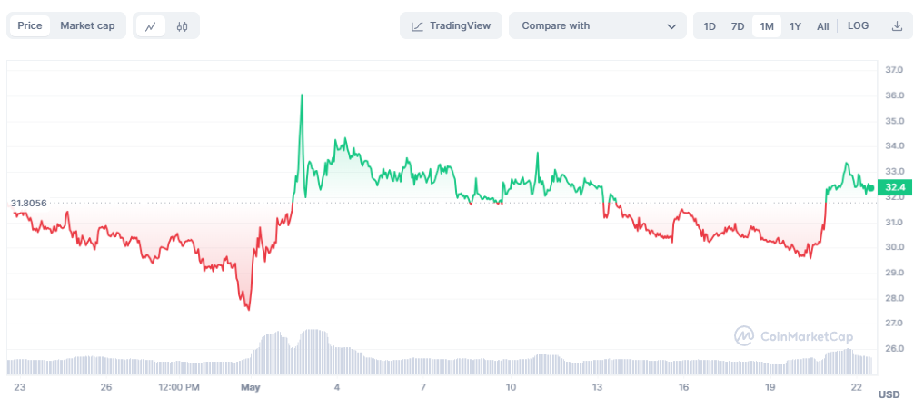 Aktualnie cena monety utrzymuje się na stabilnym poziomie 32.36 USD.