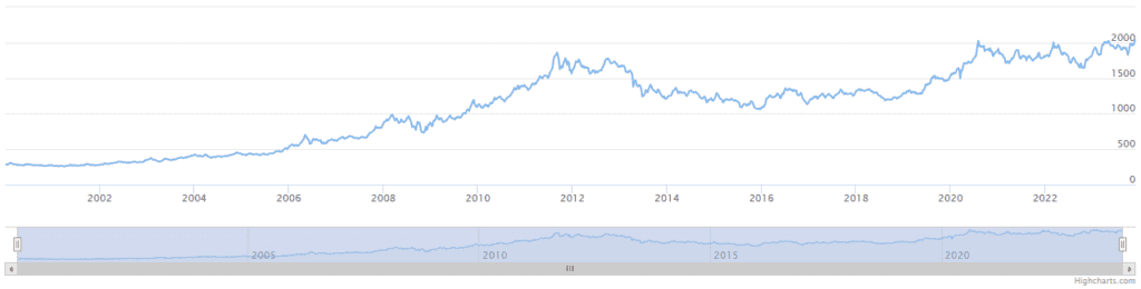 Kurs złota wyrażonego w dolarach amerykańskich na przestrzeni pierwszych dekad XXI w.Pobiliśmy więc rekord. Ostatnie maksima złoto osiągnęło w sierpniu 2020r., kiedy to żółty metal dobił do poziomu 2075,47 dolarów za uncję. Wówczas na rynku panowały poważne obawy co do tego, jak będzie wyglądała przyszłość w związku z rozwojem trwającej od wiosny pandemii wirusa COVID-19.