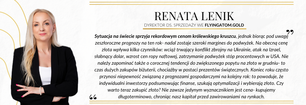 O obszerniejszy komentarz na temat poprosiliśmy p. Renatę Lenik, dyrektora ds. sprzedaży w firmie FlyingAtom.Gold i eksperta od rynku złota: