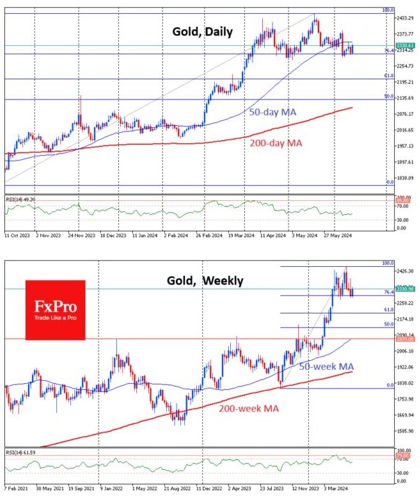 Dzienne i tygodnniowe wykresy dla złota (źródło: Actionforex.com)Dane opublikowane w ubiegłym tygodniu wykazały pewne osłabienie presji cenowej w USA, sugerując, iż rynek pracy traci impet, podtrzymując nadzieje na wrześniową obniżkę stóp procentowych.