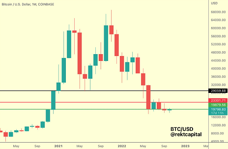 „Technicznie rzecz biorąc obecny poziom jest oznaką niedźwiedziej kontynuacji, chyba iż BTC będzie w stanie odzyskać zielone jako wsparcie, w zakresie od 19 800 do 23 300 USD – powiedział Rekt Capital.