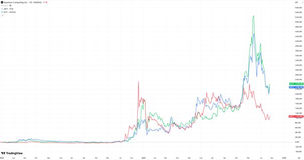 Natomiast w przypadku spółek Quantum i Rigetti z branży, mnożniki wyceny EV/Sales, czyli wartość przedsiębiorstwa do wartości przychodów (nie zysków, tylko przychodów) osiągają poziomy liczone w tysiącach. Tak w tysiącach. Dla Rigetti jest to ponad 1100x, a dla Quantum Computing ponad 3700x. To znaczy, iż roczne przychody spółki są wyceniona na 3700 razy. Jak bardzo musiałyby one wzrosnąć i w jakim tempie w przyszłości, żeby te mnożniki miały jakikolwiek sens? Nie wiem, ale na oko widać, iż tutaj cena żyje czystą spekulacją i o żadnej wycenia nikt tam nie myśli. Dla porównani jeszcze tylko dodam, iż Nvidia jest tym samym wskaźnikiem EV/Sales wyceniania na poziomie 23x.
