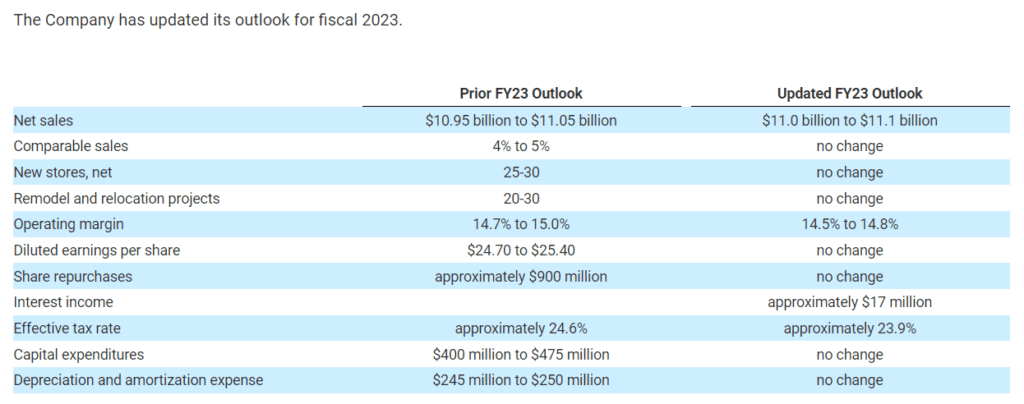 Źródło: Ulta BeautyWarto odnotować, iż spółka utrzymała plan skupu akcji na kwotę 900 mln$ (obecna kapitalizacja to nieco ponad 20 mld$) oraz plan wydatków inwestycyjnych (400 – 475 mln$).