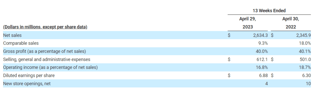 Pod koniec maja spółka podała do wiadomości wyniki za I Q 2023 roku. Kwartalne wyniki były lepsze od oczekiwań. Zysk na akcję wyniósł 6,88$, co było wynikiem o 4 centy lepszym od oczekiwań. Z kolei przychody firmy wyniosły 2,634 mld$ co było zgodne z oczekiwaniami analityków.