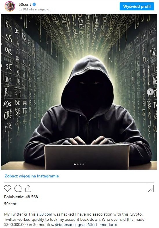 Raper 50 Cent poinformował swoich obserwujących na Instagramie, iż hakerzy wykorzystali jego konto X do przeprowadzenia wielomilionowej transakcji związanej z memecoinami.