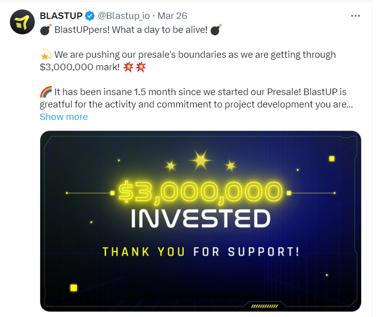 Natywny token BlastUP, BLP, napędza ekosystem swoją wysoką użytecznością. Trwająca przedsprzedaż zebrała już imponujące 3 miliony dolarów, a pierwsi inwestorzy wciąż napływają.