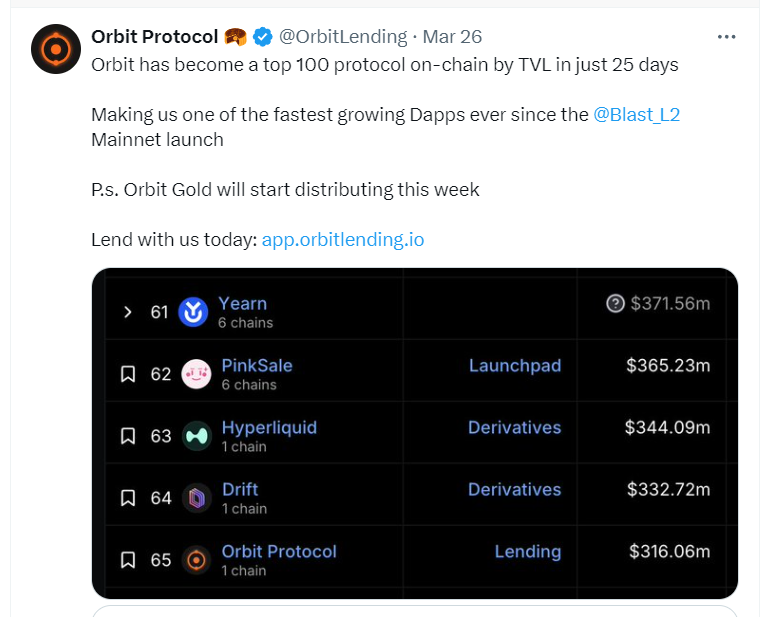 Orbit jest najważniejszym protokołem DeFi w ekosystemie Blast. Protokół ten oferuje użytkownikom możliwość płynnego udzielania i zaciągania pożyczek w aktywach kryptograficznych w ramach Blast, co dodatkowo ułatwia transakcję poprzez nagradzanie uczestników wymiernymi zachętami. Dodatkowo Orbit wprowadza własny token natywny ORBIT, zwiększający atrakcyjność i użyteczność platformy.
