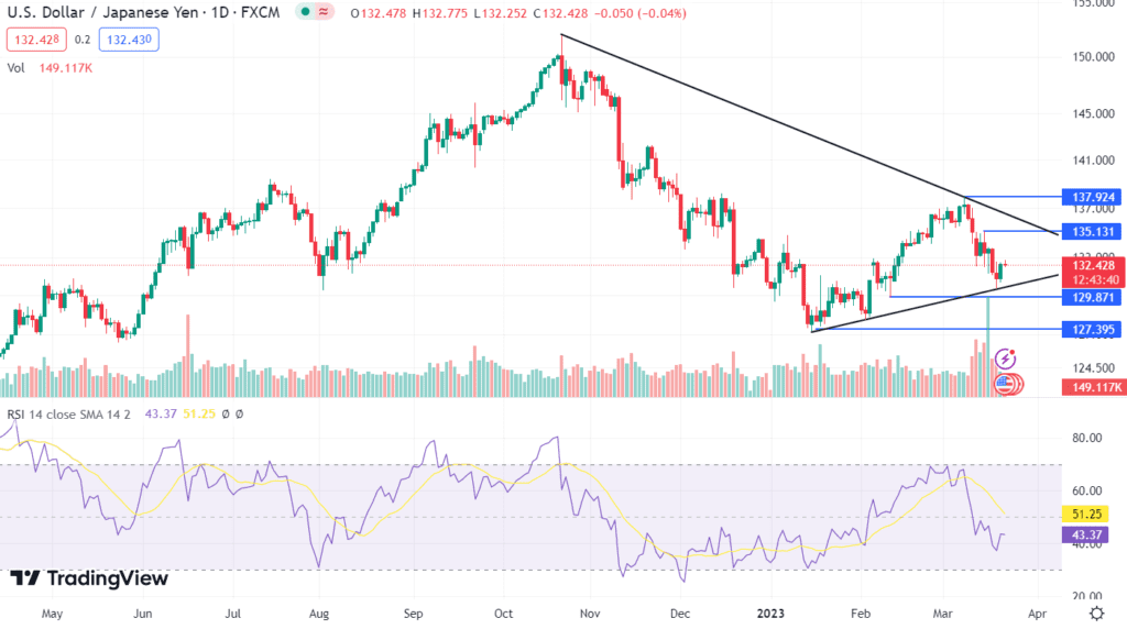 Byki do potwierdzenia trwania impulsu wzrostowego potrzebują sekwencji wyższych szczytów i dołków na niższych interwałach czasowych (H4, H1). Ze względu na korzystną relację zysku do ryzyka dobrym miejscem do zajęcia długiej pozycji są okolice linii trendu wzrostowego. Innym pomysłem jest poczekanie na przebicie i następnie retest lokalnego szczytu (133,83). Wcześniejszym, lokalnym szczytem jest poziom 132,78. W przypadku zrealizowania się scenariusza wzrostowego, istnieje możliwość przetestowania poziomu 135, czyli okolic górnego ograniczenia trendu spadkowego. Jego przebicie otworzy drogę do przetestowania maksimum z 8 marca 2023 roku (137,91). Byki stracą, krótkoterminową przewagę wraz z przebiciem linii trendu wzrostowego. Wtedy prawdopodobny będzie test dołka z 10 lutego (129,79).