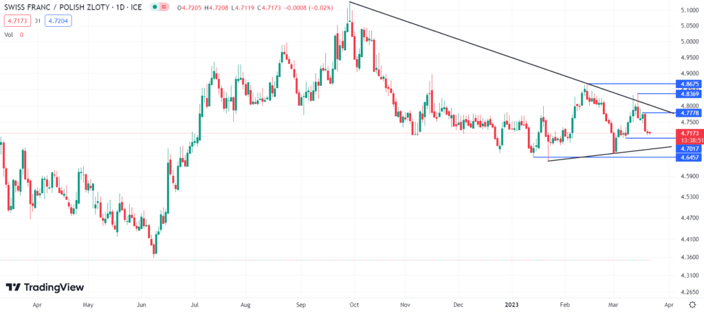 Kurs franka szwajcarskiego do złotego od końca października 2022 roku porusza się w trendzie bocznym. Oczywiście zdarzają się silne impulsy, zarówno wzrostowe jak i spadkowe. Jednak pozostają one w ramach konsolidacji między poziomem 4,65 – 4,90. Oczywiście wewnątrz dużej konsolidacji, zdarzają się mniejsze. Optymalną strategią jest granie “od bandy do bandy”. W okolicach wsparć można zajmować długie pozycja, a przy oporach krótkie. Gra na wybicia z konsolidacji stwarzają na razie słabą relację zysku do ryzyka.
