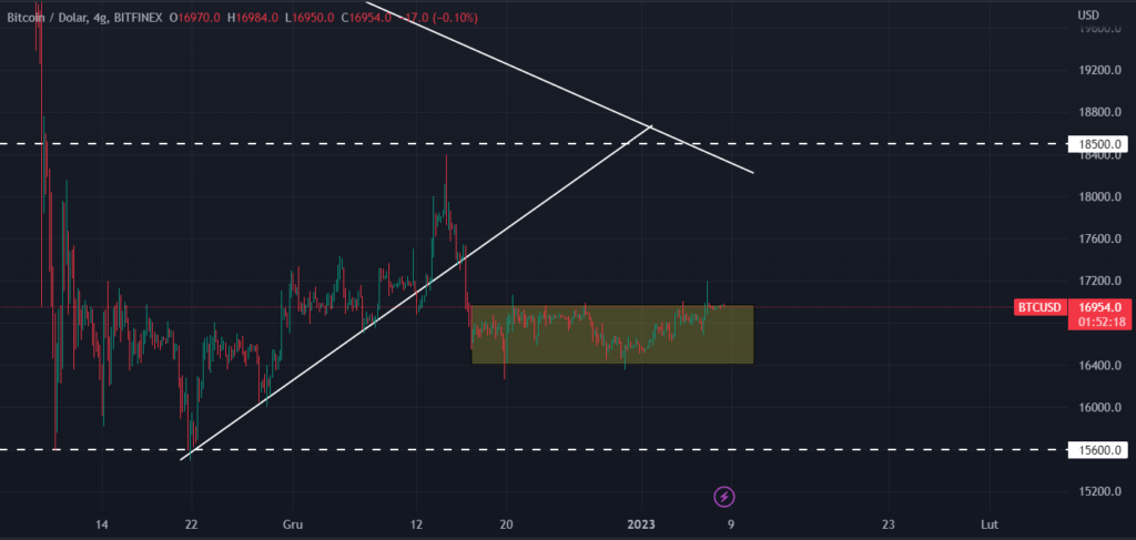 Na wykresie 4-godzinnym, cena BTC (Bitcoin) znajduje się w konsolidacji cenowej, czyli w podobnym zakresie cenowym już od połowy grudnia. Cena odbijała się w granicach 16400$ – 17000$, co pokazuje naprawdę małą zmienność w ostatnich tygodniach.