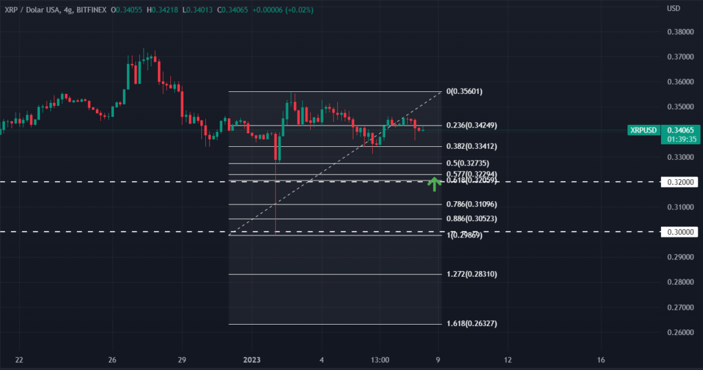 W przeciwieństwie do BTC i ETH, projekt XRP na początku roku (2 stycznia) zanotował bardzo mocny spadek – ale chwilowy. Cena przebiła pierwszą linię wsparcia momentalnie, ale odbiła się od drugiej na poziomie 0.30000$. Na ten moment nie widać dużej presji popytowej na XRP, tak więc bardzo prawdopodobne jest kolejne „zaatakowanie” poziomu 0.32000$, które w tej chwili jest również poziomem 0.618 Fibonacciego – biorąc pod uwagę ten długi spadkowy knot.
