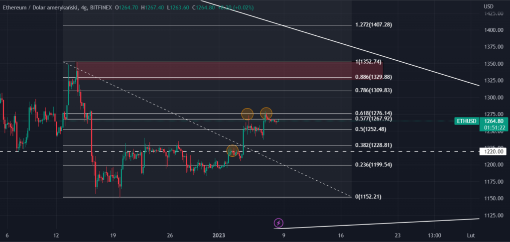 Ethereum (ETH) zdecydowanie zaliczył inny tydzień niż jego poprzednik Bitcoin. W poniedziałek i wtorek na początku nowego roku ETH zareagował po raz kolejny na poziom 1220$, który jest naprzemiennie traktowany przez rynek jako wsparcie i opór. W środę nastąpiło jego przebicie w mocny sposób. Kolejno warto zauważyć, jak cena respektuje kolejne ważne poziomy mierzenia Fibonacciego, czyli odbicie się dwa razy od 0.618. Reakcja spadkowa od tego poziomu jest jednak stosunkowo mała i wydaje się, iż w kolejnych dniach cena ETH będzie tak samo rosła jak w przypadku BTC.