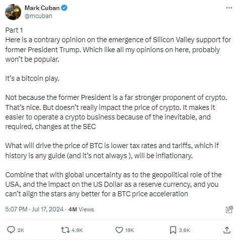 Źródło: https://x.com/mcuban/status/1813591281970348264Cuban jest przekonany, iż w takiej sytuacji „BTC może być tym, co kraje i osoby będą chciały kupić, aby chronić swoje oszczędności. […] Może to sprawić, iż BTC stanie się dokładnie tym, co wyobrażają sobie jego zwolennicy: walutą globalną”.