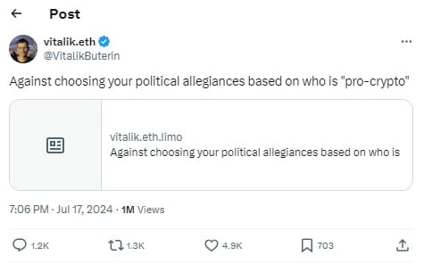 Źródło: https://x.com/VitalikButerin/status/1813621264017207581Ponadto Buterin radzi, by weryfikować aktualne wypowiedzi polityków, którzy deklarują poparcie dla kryptowalut, z ich przeszłymi komentarzami na ten temat. Bowiem często okazuje się, iż ich poglądy nagle się zmieniają. Zwykle w trakcie kampanii wyborczych, gdzie liczy się każdy głos.