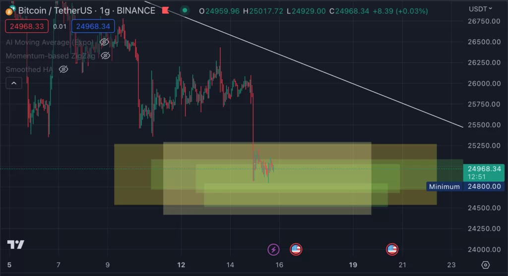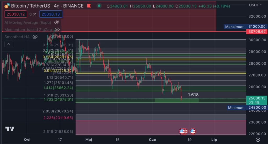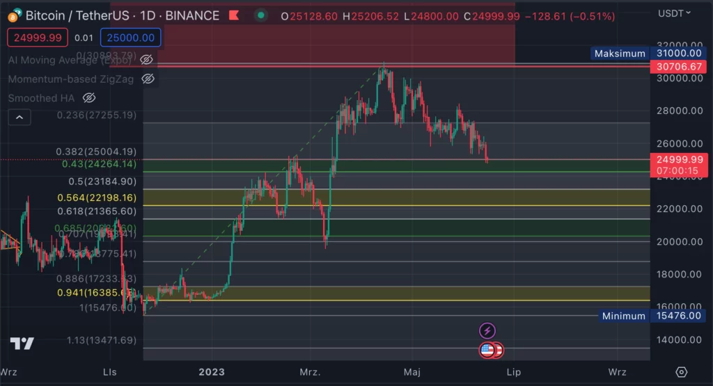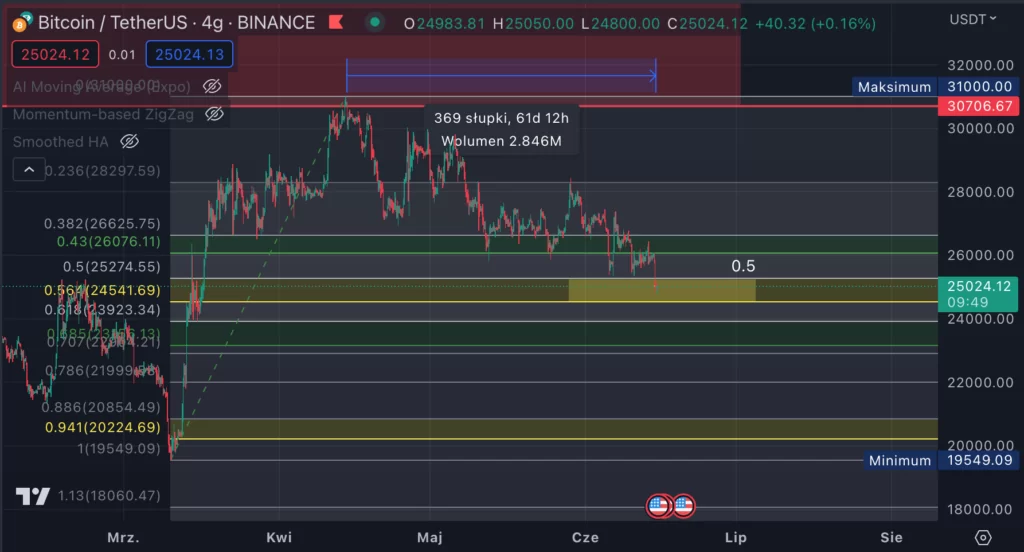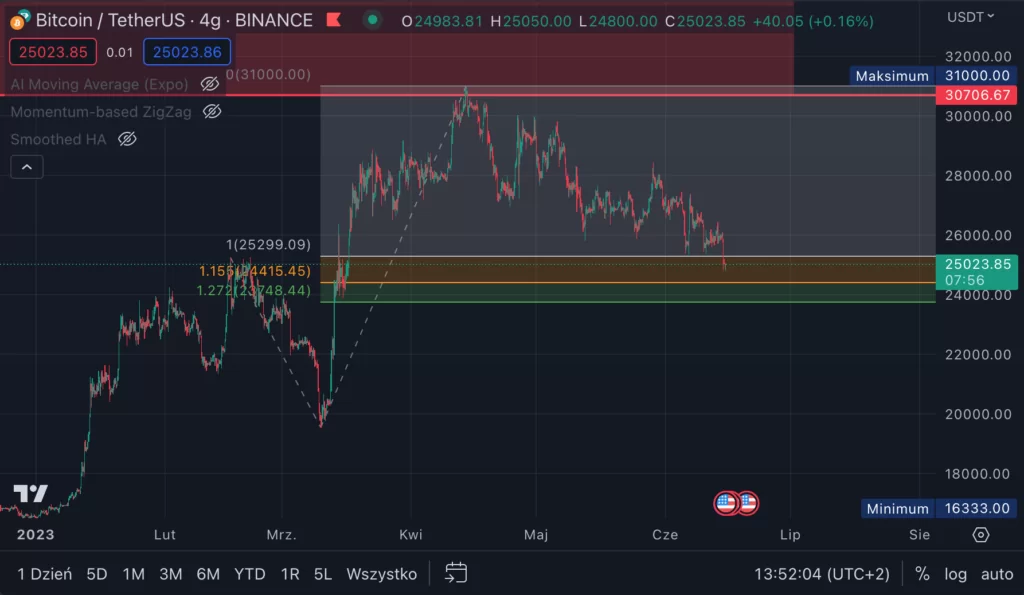 Pierwszą strefą jest 0.38 dużego mierzenia Fibonacciego, całego ruchu wzrostowego. Mierzonego od ostatniego dołka w okolicach 15 000 dolarów za jedną sztukę BTC.