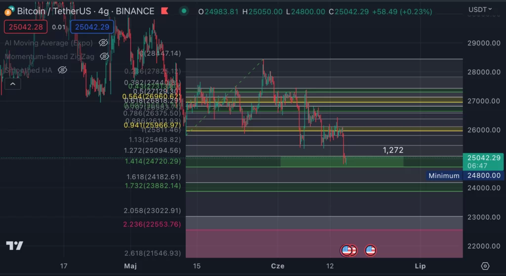 UWAGA – bardzo ważnym, acz negatywnym sygnałem jest fakt, iż nie ma na ten moment żadnej wyraźnej reakcji popytowej. Nie obserwujemy nagłego wybicia do góry, czy czegoś na kształt formacji V-shape (na żadnym z interwałów!). Strefa nie wybroniła ceny na jej granicy (czyli 27275 dolarów +/- kilkanaście dolarów), tylko zwolniła cenę dopiero po wyraźnym wejściu w jej obręb. To jeszcze nie przesądza możliwości „odjechania” z tych rejonów, ale musimy mieć na uwadze po prostu brak wyraźnej reakcji na naprawdę istotny rejon wynikający z analizy technicznej.