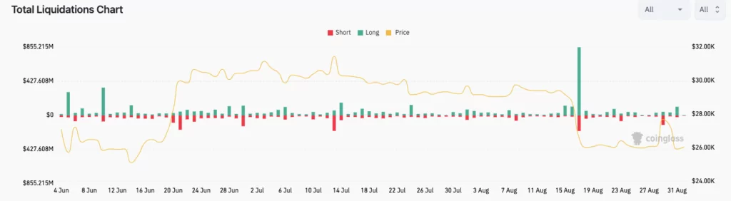 Źródło: Glassnode, AliChartsPrzełamanie 23 000 USD nie byłoby dla części niedźwiedzi zaskoczeniem. Jeden z analityków on-chain przytaczanych przez Cointelegraph wskazał, iż 24 750 USD musi zostać utrzymane, aby byki miały szansę na odreagowanie. Dane CoinGlass wskazały, iż 31 sierpnia wywołał największy wolumen długich likwidacji BTC od czasu 10% spadku Bitcoina na początku miesiąca. Likwidacje wyniosły 41 milionów dolarów, a łączna ich suma wyniosła 108 milionów dolarów.