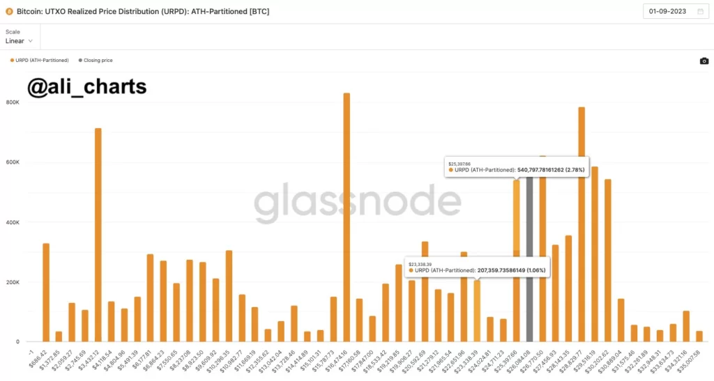 Cena Bitcoina spadła o blisko 1000 USD w ciągu dwóch godzin. Kryptowaluta nowy miesiąc wita spadkami, po 11% spadkach w sierpniu. Według części analityków on-chain poniżej 25,400 USD nie ma silnego popytu, co może sprzyjać szybkiej korekcie w stronę 23,000 USD. Poniższy wykres Glassnode śledzi on cenę, po której otwierano bieżące transakcje. To działa jako pewnego rodzaju mapa popytu i podaży. Pomaga w szacowaniu poziomów wsparcia i oporu cenowego.