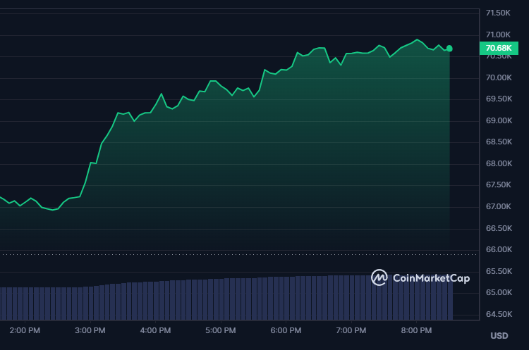 Cena Bitcoina (BTC) ponownie przekroczyła magiczną granicę 70 000 USD, wywołując falę optymizmu w całym sektorze kryptowalut. Odrodzenie to nastąpiło po okresie korekty, w czasie której Bitcoin cofnął się z rekordowego szczytu 73 797,68 USD który zdobył w dniu 14 marca 2024 r. Na moment powstawania tego tekstu kurs BTC wynosił 70 701 USD, co oznacza sporą aprecjację o 7,66% według danych z portalu CoinMarketCap.