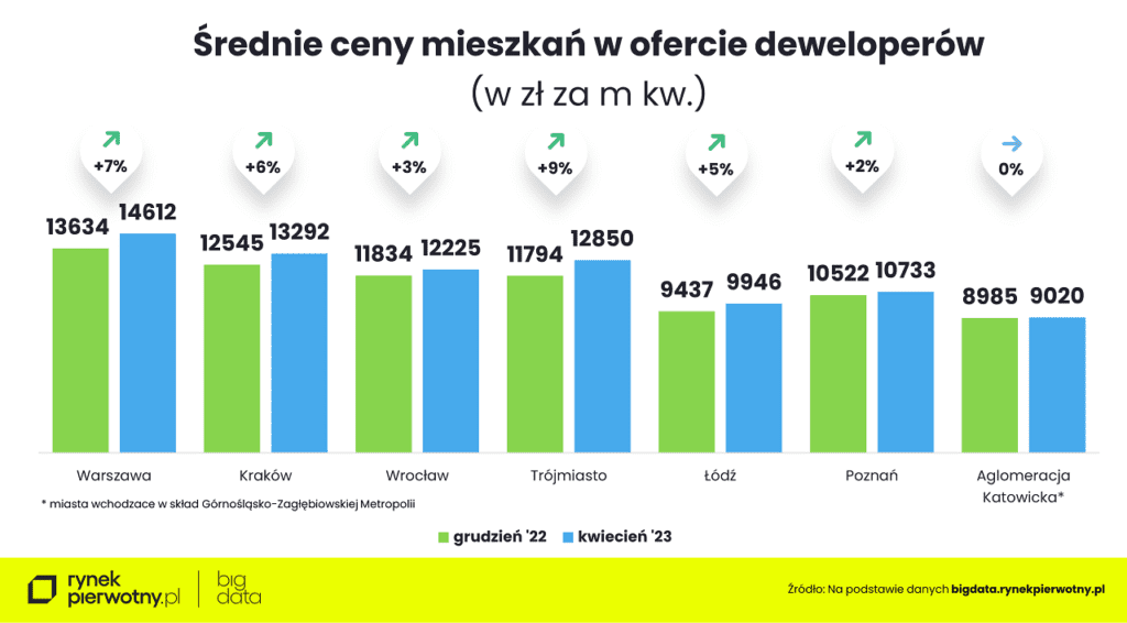 Ewenementem w skali krajowej jest Śląsk. Tam, o dziwo, ceny zatrzymały się w kwietniu i są równe grudniowi zeszłego roku. Średni koszt metra kwadratowego w Katowicach to „zaledwie” 8,8 tysięcy złotych, co w tej chwili jest atrakcyjną ceną jak na duże miasto.