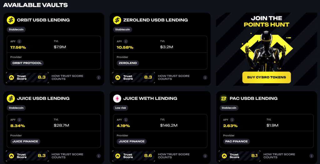 Z pomocą aplikacji CYBRO użytkownicy mogą wybierać skarbce z konkurencyjnym rocznym zyskiem procentowym (APY), aby idealnie dopasować je do swoich strategii.