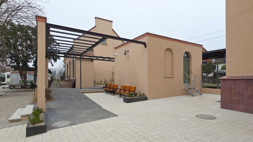 Między dworcem a tzw. starą apteką powstała otwarta poczekalnia letnia. W miejscu częściowo rozebranego budynku, z którego pozostawiono jedynie mur, urządzono przestrzeń z pergolą porośniętą pnączami, ławkami oraz koszami. Zlokalizowano tu również niewielki obiekt mieszczący instalacje telekomunikacyjne do obsługi ruchu pociągów.