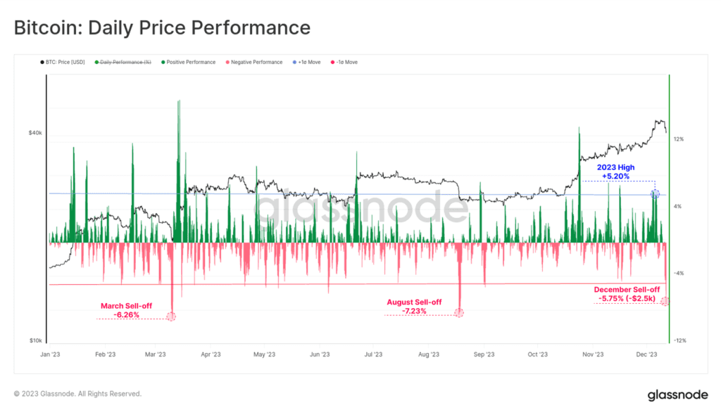 Rynek Bitcoina wykonał w ubiegłym tygodniu szalony ruch, otwierając się na poziomie 40,2 tys. dolarów, osiągając nowe roczne maksimum na poziomie 44,6 tys. dolarów, a następnie gwałtownie wyprzedając się do 40,2 tys. dolarów późnym wieczorem w zeszłą niedzielę. Wzrost do rocznego maksimum składał się z dwóch etapów, po ponad +5% dziennie (+1 odchylenie standardowe). Wyprzedaż była równie silna, wymazując ponad 2,5 tys. USD (-5,75%), co stanowi trzeci największy jednodniowy ruch w dół, w 2023 roku.