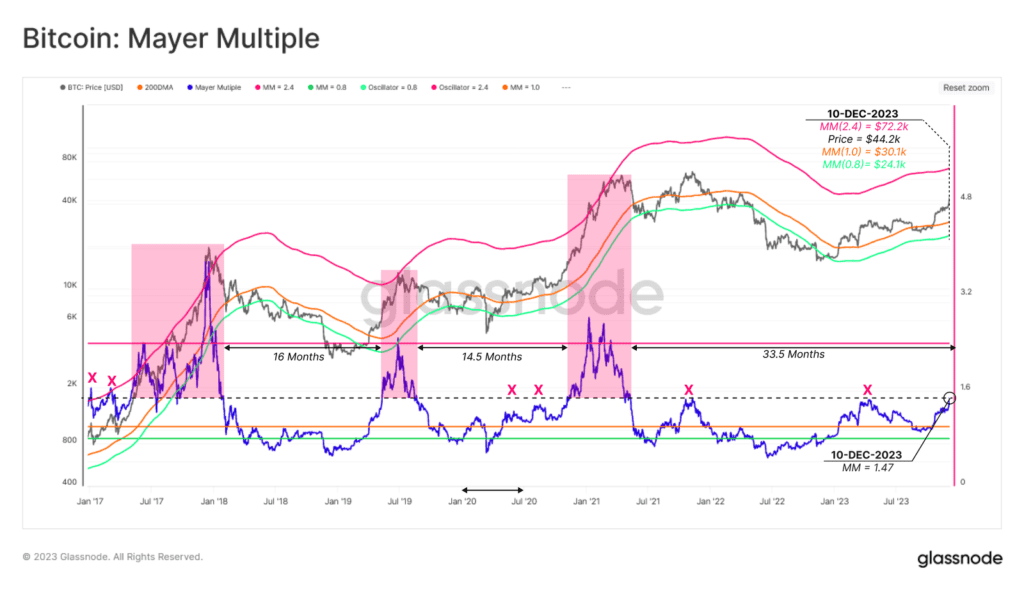 Źródło: GlassnodeMnożnik Mayera to inny, popularny techniczny model wyceny Bitcoina. Opisuje po prostu stosunek ceny do 200-dniowej średniej kroczącej. 200-dniowa średnia krocząca jest powszechnie uznawanym wskaźnikiem służącym do ustalania etapu cykli byka lub niedźwiedzia. to czyni ją użytecznym punktem odniesienia do oceny warunków wykupienia i wyprzedania. W przeszłości warunki wykupienia i wyprzedania zbiegały się z wartościami mnożnika Mayera przekraczającymi odpowiednio 2,4 lub poniżej 0,8. Obecna wartość wskaźnika wielokrotności Mayera wynosi 1,47, blisko poziomu ~ 1,5, który często stanowi poziom oporu w poprzednich cyklach, w tym ATH z listopada 2021 roku. Jako wskaźnik dotkliwości bessy posłużył w cyklu 2021-22. Minęło 33,5 miesiąca od przełamania ówczesnego poziomu, co jest najdłuższym okresem od bessy z lat 2013-16.