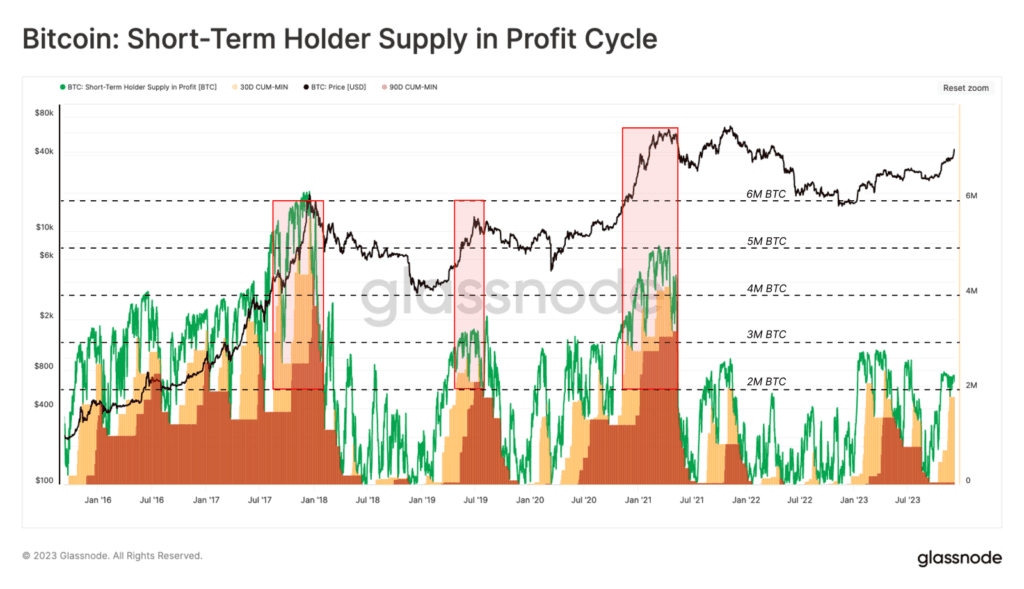 Historycznie rzecz biorąc, rajdy w kierunku nowych ATH zbiegają się z 90-dniowym wskaźnikiem STH, sięgającym powyżej 2 mln BTC. To sugeruje umiarkowanie długi czas utrzymywania zyskow, przez tę grupę (solidną bazę inwestorów). Rajd od października podniósł przede wszystkim wariant BTC utrzymywanych w zysku przez mniej niż 30 dni, co sugeruje, iż solidne fundamenty po stronie krótkoterminowych spekulantów, nie zostały jeszcze ustanowione od czasu gdy BTC wspiął się powyżej poziomu 30 tys. dolarów, w mniej więcej połowie cyklu. Glassnode sugeruje również, iż rajdy z 2023 r. są stosunkowo niskie w porównaniu z poprzednimi cyklami, co potwierdza wyższą, względną podaż.