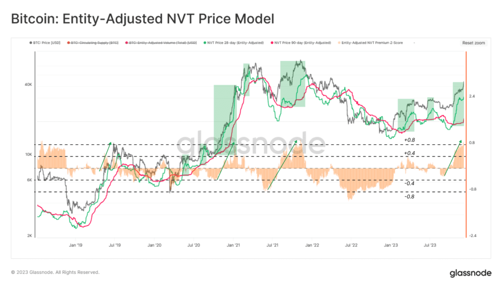 Źródło: GlassnodeInnym sposobem oceny „wartości godziwej” Bitcoina jest przełożenie aktywności on-chain, na cenę dzięki modelu NVT Price. NVT Price poszukuje fundamentalnej wyceny, w oparciu o użyteczność jako platformy rozliczeniowej wg. wartości w USD. Glassnode rozważa wariant 28-dniowy (zielony) i 90-dniowy (czerwony). Są one parą szybszych i średnio-terminowych sygnałów. Typowa faza przejściowa od niedźwiedzia do byka pokazuje, iż szybszy 28-dniowy wariant znajduje się powyżej 90-dniowego modelu, (od października). NVT Premium, (pomarańczowe punkty), można również wykorzystać do oceny cen spot w stosunku do wolniejszej 90-dniowej ceny NVT. Niedawny wzrost spowodował jeden z najostrzejszych skoków wskaźnika premii NTV od szczytu rynku w listopadzie 2021 roku. Sugeruje to potencjalny krótkoterminowy sygnał 'przeszacowania’ w stosunku do aktywności w sieci Bitcoin.