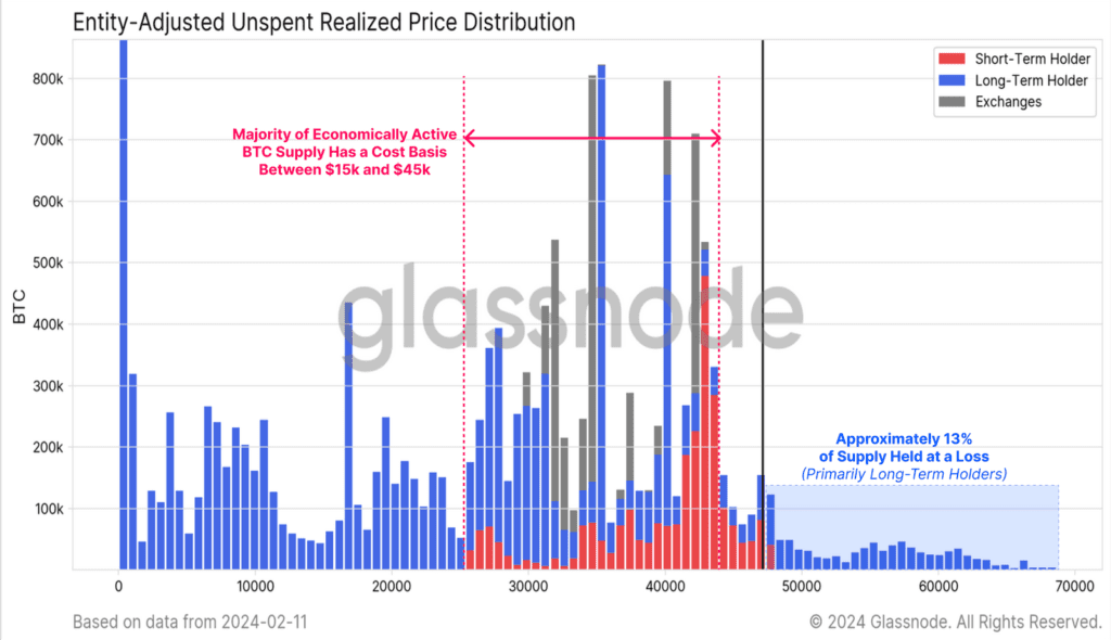 W miarę jak rynek podąża wyżej, zdecydowana większość BTC przeszła teraz w stan zysków. W rzeczywistości tylko 13% całkowitej podaży zostało nabyte powyżej 48 tys. USD, a zatem chwilowo znajdowało się w stanie straty. Poniższy wykres przedstawia podział podaży BTC według podstawy kosztu czyli cen, po której został nabyty. Widzimy, iż zdecydowana większość została kupiona poniżej 48 tys. USD, z bardzo dużym skupiskiem posiadaczy krótkoterminowych w przedziale od 40 do 45 tys. USD. Posiadacze długoterminowi dominują w w/w 13% podaży utrzymywanej ze stratą, odzwierciedlając 'optymistów’ ze wspomnianych 141 dni handlowych w 2021 roku.