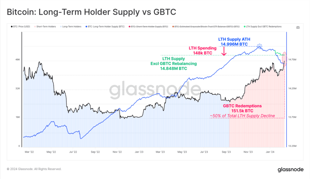 Rynek odnotował znaczny wzrost spekulacji w okresie poprzedzającym zatwierdzenie spot ETF w styczniu. W odpowiedzi wielu długoterminowych posiadaczy (LTH) dokonało transakcji, czy to w celu realizacji zysków, czy też w celu ponownego zdeponowania środków, w jednym z nowych produktów ETF. W sumie saldo podaży długoterminowej spadło o około 299,5 tys. BTC od czasu, gdy wskaźnik osiągnął szczyt w listopadzie ubiegłego roku (na poziomie 14,996 mln BTC).