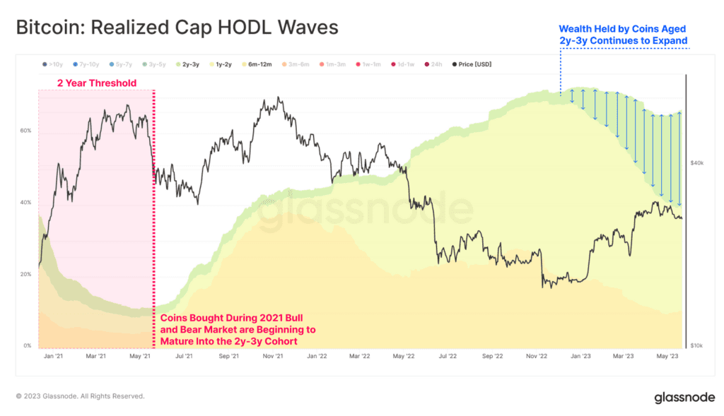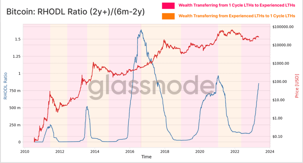 Źródło: GlassnodeGlassnode wykorzystał nowy wariant wskaźnika RHODL, porównując majątek posiadany przez podaż powyżej 2 lat z zasobami BTC w przedziale wiekowym 6 miesięcy do 2 lat. To może pomóc ocenić równowagę między doświadczonymi inwestorami (ponad 2 lata) i posiadaczami w bieżącym cyklu (od 6 miesięcy do 2 lat). w tej chwili ten wariant RHODL rośnie wykładniczo, co sugeruje, iż znaczna część posiadaczy z cyklu 2021-22 dojrzewa do doświadczonych posiadaczy HODLerów. Presja na realizacje zysków i strat jest zatem wciąż bardzo niska. Biorąc pod uwagę niezwykłą i głównie spadkową zmienność doświadczaną w tym okresie, pokazuje to, iż baza posiadaczy Bitcoina pozostaje niezwykle pewna, co jest godnym uwagi i być może konstruktywnym czynnikiem.