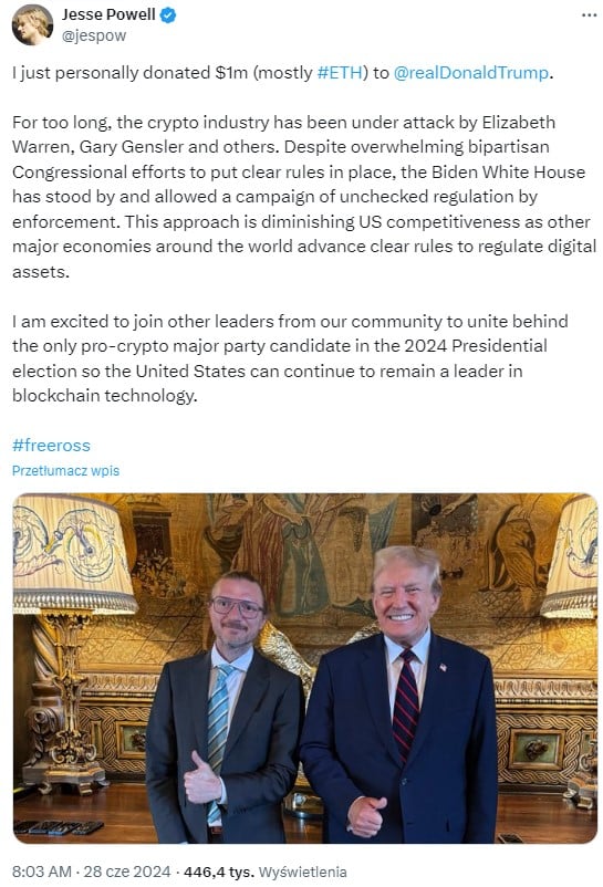 Jesse Powell, współzałożyciel firmy Kraken, wsparł kampanię wyborczą Donalda Trumpa kwotą 1 miliona dolarów w Ethereum.