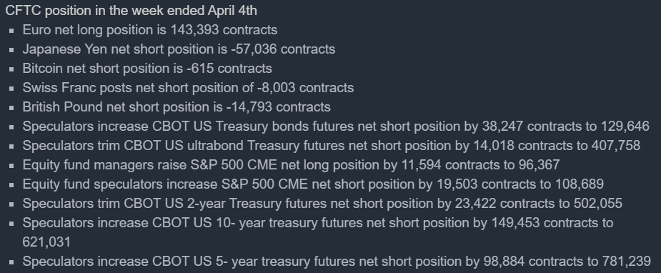 Zmiana pozycjonowania Federalnej Komisji Handlu, w tygodniu skończonym 4 kwietnia. Duża pozycja byków na EUR potwierdza, iż rynki grają na postępującą słabość amerykańskiego dolara. Wyceniają koniec podwyżek FED i kolejny jastrzębi ruch ze strony EBC. Europejski Bank Centralny w opóźnieniu zaczął podnosić stopy. Spekulanci i zarządzający fudnuszami inwestycyjnymi wciąż nie są zgodni co do kierunku S&P500. Zarządzający podnieśli ekspozycję na pozycjach długich o ponad 10%. Spekulanci z kolei znacząco zwiększyli krótkie pozycje na S&P500 z 89 000 do blisko 108 tys! Duża zmiana pozycjonowania na pozycjach na spadki potwierdza, iż spora ilość spekulantów w krótkim terminie przewiduje 'recesyjne spadki’ na Wall Street. Widzimy też olbrzymi wzrost shortów na amerykańskich 5 i 10 letnich obligacjach, co potwierdza iż rynek dostrzega spowolnienie jako coraz bardziej prawdopodobne.