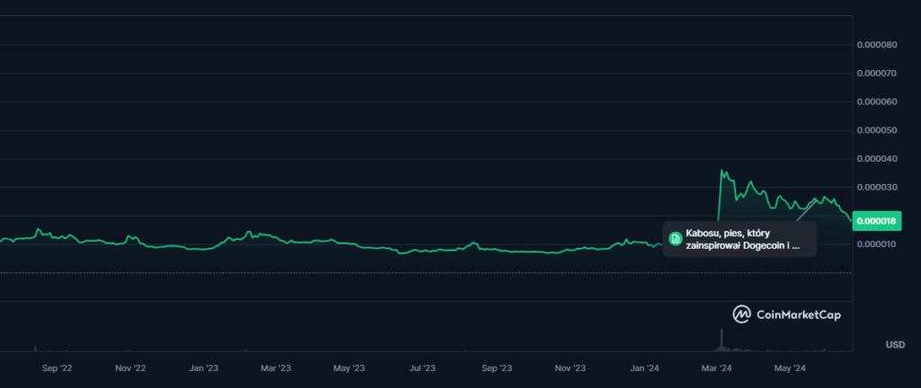 Wykres kryptowaluty SHIB, źródło: CoinMarketCapW krótkim okresie token SHIB stoi przed widmem wytężonych ataków niedźwiedzi. Na wykresie tygodniowym stracił on ponad 15% swojej wartości w przeciągu ostatnich 7 dni i jest w tej chwili notowany na poziomie około 0,0000180 dolara. Kryptowaluta daje oznaki znaczącej zmienności i dopiero co wybiła się poniżej pułapu wyznaczonego przez lokalne wsparcie. Najbliższe odbicie może nastąpić w rejonie 0,000015 USD, czyli w miejscu które wcześniej przez wiele miesięcy funkcjonowało jako lokalny opór.